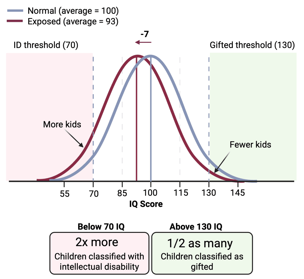 A 7-point drop might sound modest. It’s not. At the population level, it doubles the number of children classified as intellectually disabled while reducing the number classified as gifted by half (3). They found that for every increase in exposure there was an increase in detrimental impacts, and for every decrease, a corresponding decrease in effect. There appeared to be no safe threshold of exposure. This is not a fringe study, other independent studies have showed similar effects.