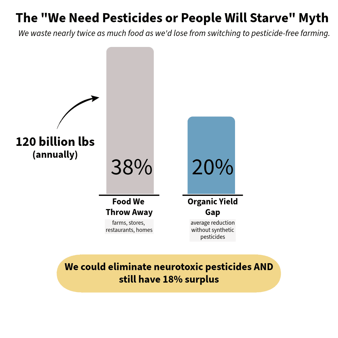 A common justification for wide-spread pesticide/herbicide use I hear is that “Americans will starve due to loss of crops”. The math doesn’t support this. Specifically, Americans throw away about 38% of food produced and the average reduction in crop yield in organic farms is about 20%. We could eliminate neurotoxic pesticides and still have 18% leftover to throw away.
