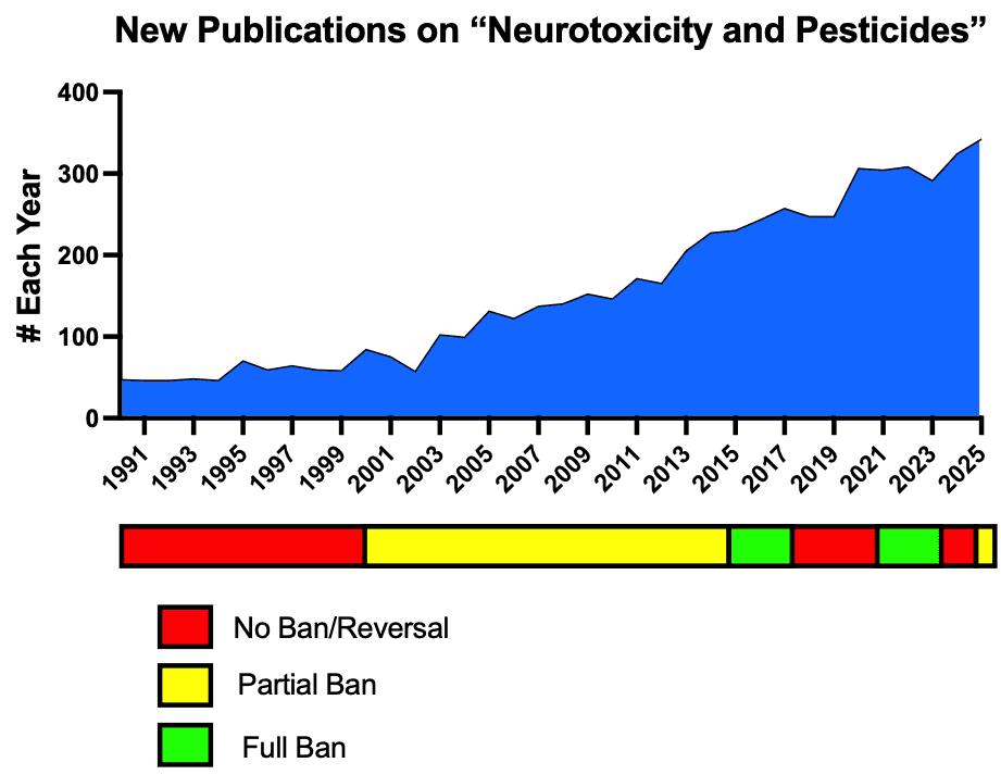 (Figure: The number of peer-reviewed publications investigating Neurotoxicity and pesticides (NCBI Index) has steadily increased over 3 decades yet we have seen discordant regulations.)